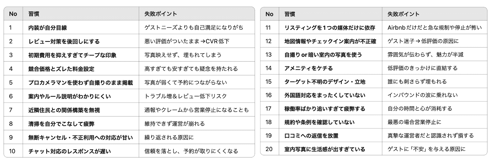 8年以上経営をしてきて分かった、民泊で失敗してしまう習慣20個がこちら